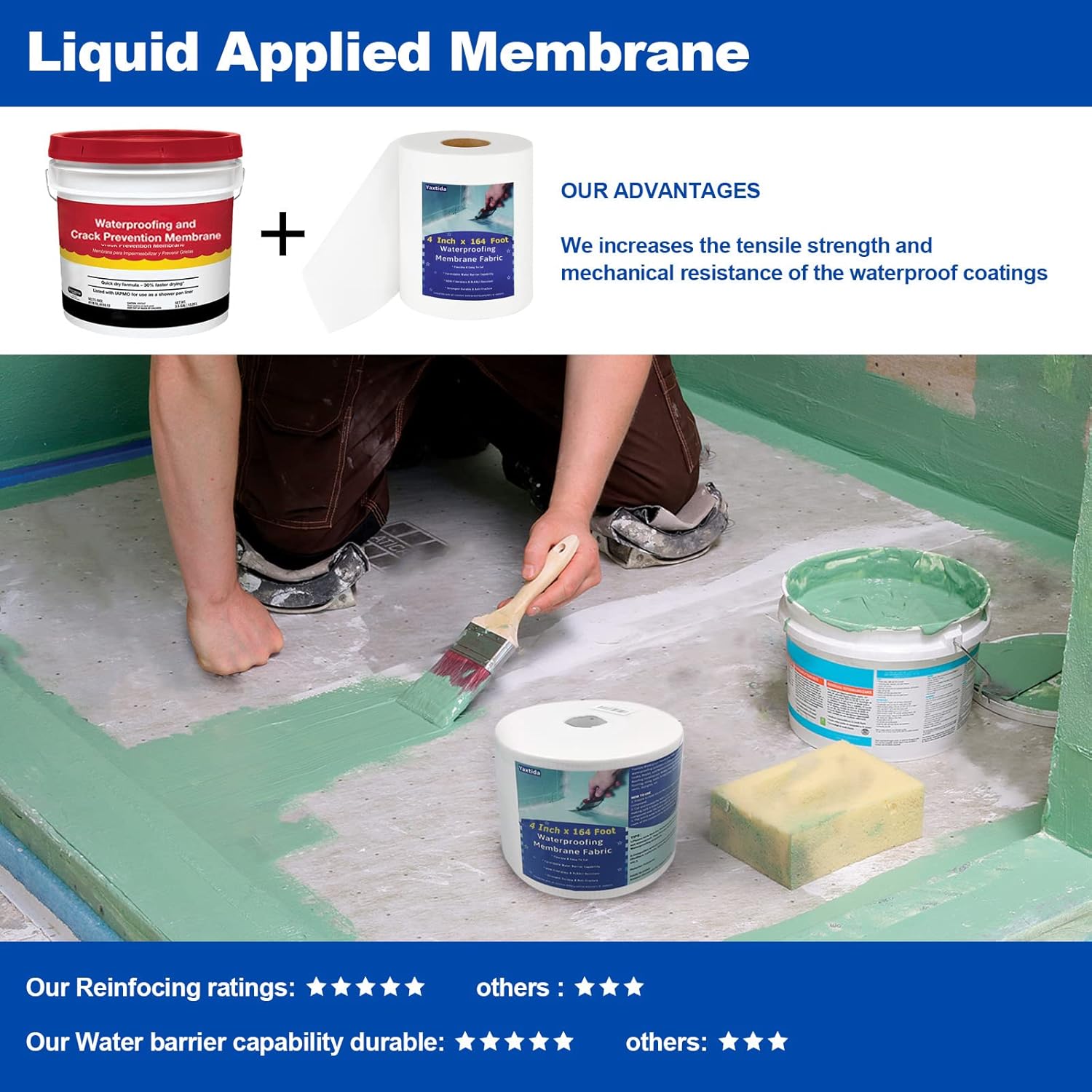 - 【Easy to use and Affordable】Save the cost of contractors and DIY. Step 1: Measure and cut reinforcement fabric needed. Step 2: Apply a thick coat of Liquid Waterproofing Membrane. Step 3: Embed mesh tape and apply 2th-4rd coatings ensuring all wrinkles and bubbles are brushed out to leave a flat smooth finish